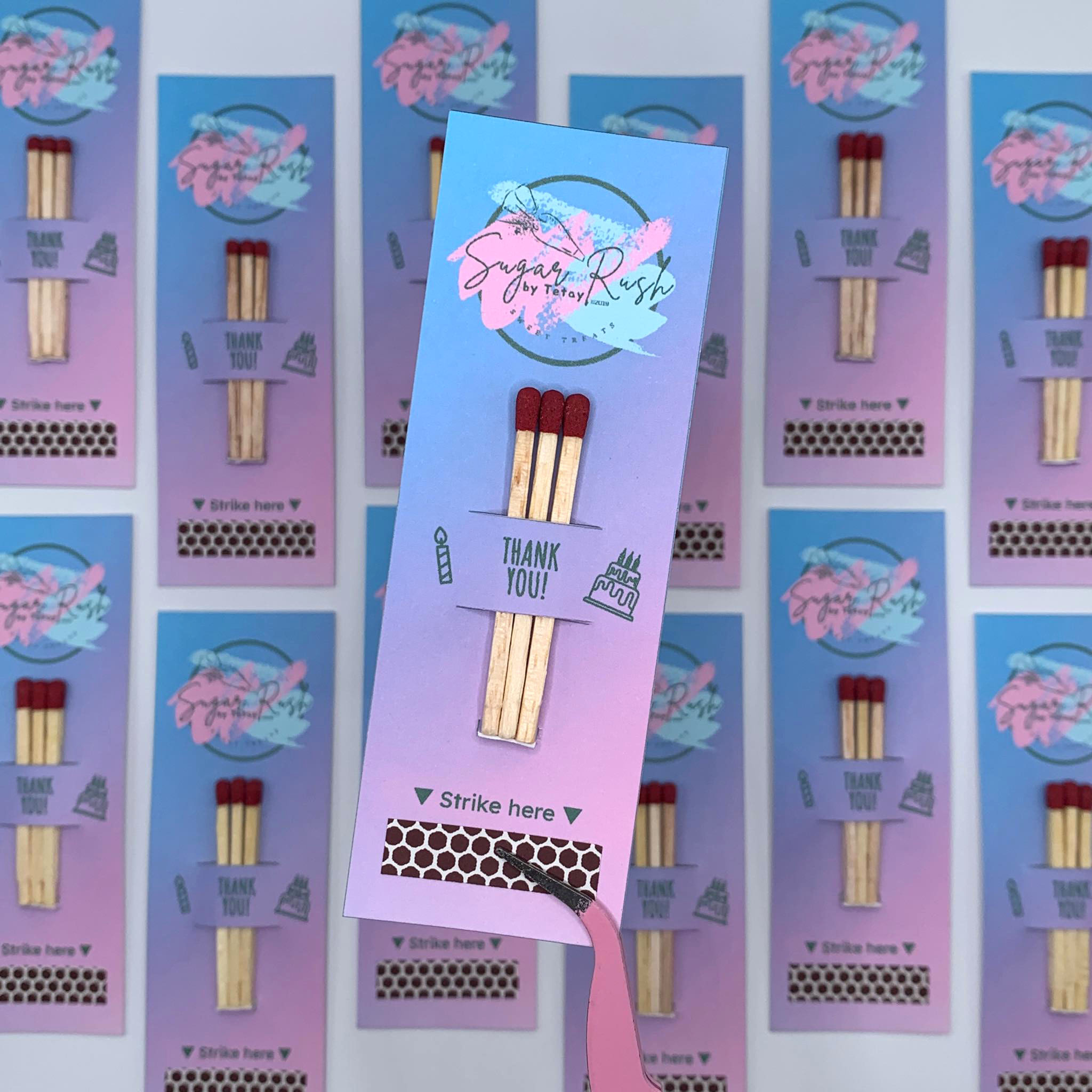 Custom-designed match cards crafted for cakes, celebrations, and unforgettable first wishes. Functional, elegant, and branded just for you.